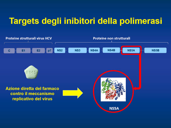Daclatasvir è un potente inibitore del complesso NS5A essenziale per la replicazione del virus dell'epatite C (HCV). (Fig. 1) Daclatasvir è il nome del principio attivo, mentre il nome commerciale è DAKLINZA®; il suo utilizzo è raccomandato in combinazione con altri antivirali ed in particolare il sofosbuvir, con o senza ribavirina, per il trattamento dei pazienti con infezione di genotipo 1, 3, 4 e in particolari casi nei soggetti con genotipo 2. Daclatasvir, in maniera simile agli altri antivirali di nuova generazione, agisce direttamente contro il virus, bloccandone il processo di replicazione. La sua azione è quindi differente da quella dell’'interferone, che stimola la risposta del sistema immunitario contro il virus e della ribavirina, che interferisce indirettamente sulla replicazione virale. In alcuni casi, è consigliata l'assunzione combinata di daclatasvir con la ribavirina, in quanto questa incrementa la possibilità di eradicazione definitiva del virus. Quando daclatasvir viene usato in combinazione con sofosbuvir, costituisce un regime del tutto orale, senza interferone, che negli studi clinici ha fornito tassi di guarigione fino al 100%, inclusi i pazienti con malattia epatica avanzata, nel genotipo 3 e in coloro che hanno precedentemente fallito il trattamento con un inibitore delle proteasi. Daclatasvir è il primo inibitore complesso NS5A autorizzato nell'Unione europea (UE) e si usa in combinazione con altri medicinali, garantendo una durata di trattamento più breve (12 o 24 settimane) rispetto alle 48 settimane di trattamento dei regimi basati su interferone e ribavirina. Il farmaco non può essere usato in monoterapia, ma associato a sofosbuvir, ribavirina e interferone in ragione del genotipo virale.  Fig.1