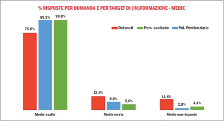 Se ci si poteva aspettare una buona padronanza della materia da parte del Personale Sanitario e della Polizia Penitenziaria siamo rimasti colpiti dal fatto che circa 3 persone detenute su 4 hanno acquisito le principali conoscenze e nozioni sull’epatite C, sulle modalità di trasmissione e sulla buona prevenzione. Considerato il grado di scolarizzazione medio basso della popolazione detenuta possiamo ritenerci molto soddisfatti del livello di apprendimento raggiunto ben oltre le aspettative iniziali.