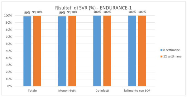 Figura 3: Risultati dello studio ENDURANCE-1, su pazienti con GT1, con cirrosi naive al trattamento o con precedente fallimento, inclusi coinfetti HIV/HCV