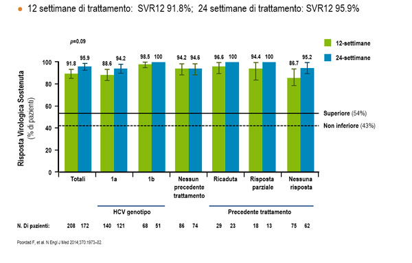 - La recidiva è stata definita come valore confermato post-trattamento di HCV RNA ≥ 25 IU/mL prima o al raggiungimento dell’SVR12 nei soggetti con HCV RNA inferiore a 25 UI/mL all’ultima osservazione nel corso di almeno 11 o 22 settimane di trattamento per soggetti assegnati rispettivamente a 12 o 24 settimane di trattamento.